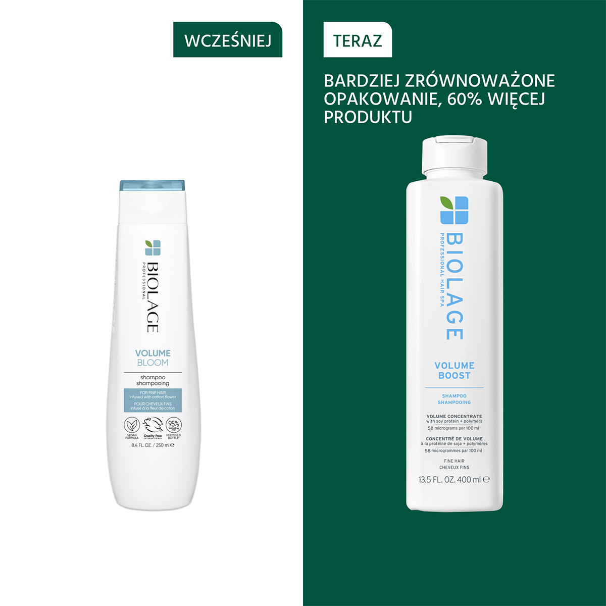 Biolage Volume Boost to lekki szampon stworzony specjalnie dla potrzeb włosów cienkich, delikatnych i pozbawionych objętości. Formuła produktu została zainspirowana naturalnymi właściwościami kwiata bawełny, który słynie ze swojej puszystości i zdolności do długotrwałego zachowywania kształtu. Szampon delikatnie oczyszcza skórę głowy i pasma, usuwając zanieczyszczenia oraz nadmiar sebum, które obciążają fryzurę. Dzięki unikalnej technologii wypełnia przestrzenie między włóknami włosa, nadając im spektakularną objętość, lekkość i sprężystość bez efektu przesuszenia.