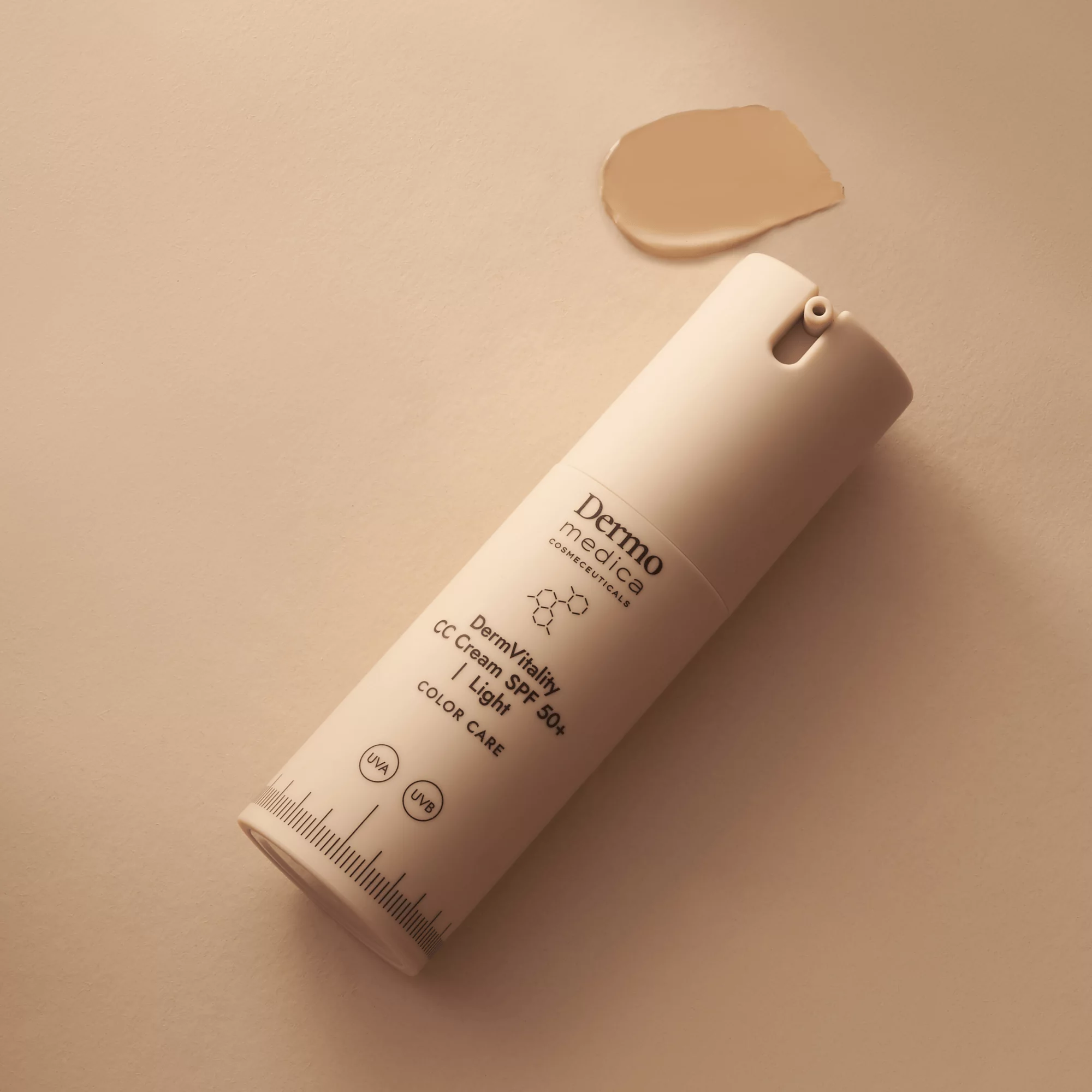 DermVitality CC Cream SPF 50+ to zaawansowany, multifunkcyjny preparat, który łączy w sobie pełną fotoprotekcję, zaawansowaną korekcję kolorytu oraz działanie pielęgnacyjne. Opracowany w oparciu o najnowszą technologię fotoprotekcyjną oraz wzbogacony o składniki nawilżające i regenerujące, w tym witaminę E i glicerynę. Formuła zapewnia nie tylko skuteczne zabezpieczenie przed promieniowaniem UVA/UVB, ale także naturalne krycie niedoskonałości, neutralizację zaczerwienień i ochronę antyoksydacyjną. Dodatkowo działa wygładzająco i odbudowująco, sprawiając, że skóra staje się jednolita, rozświetlona i komfortowa przez cały dzień.