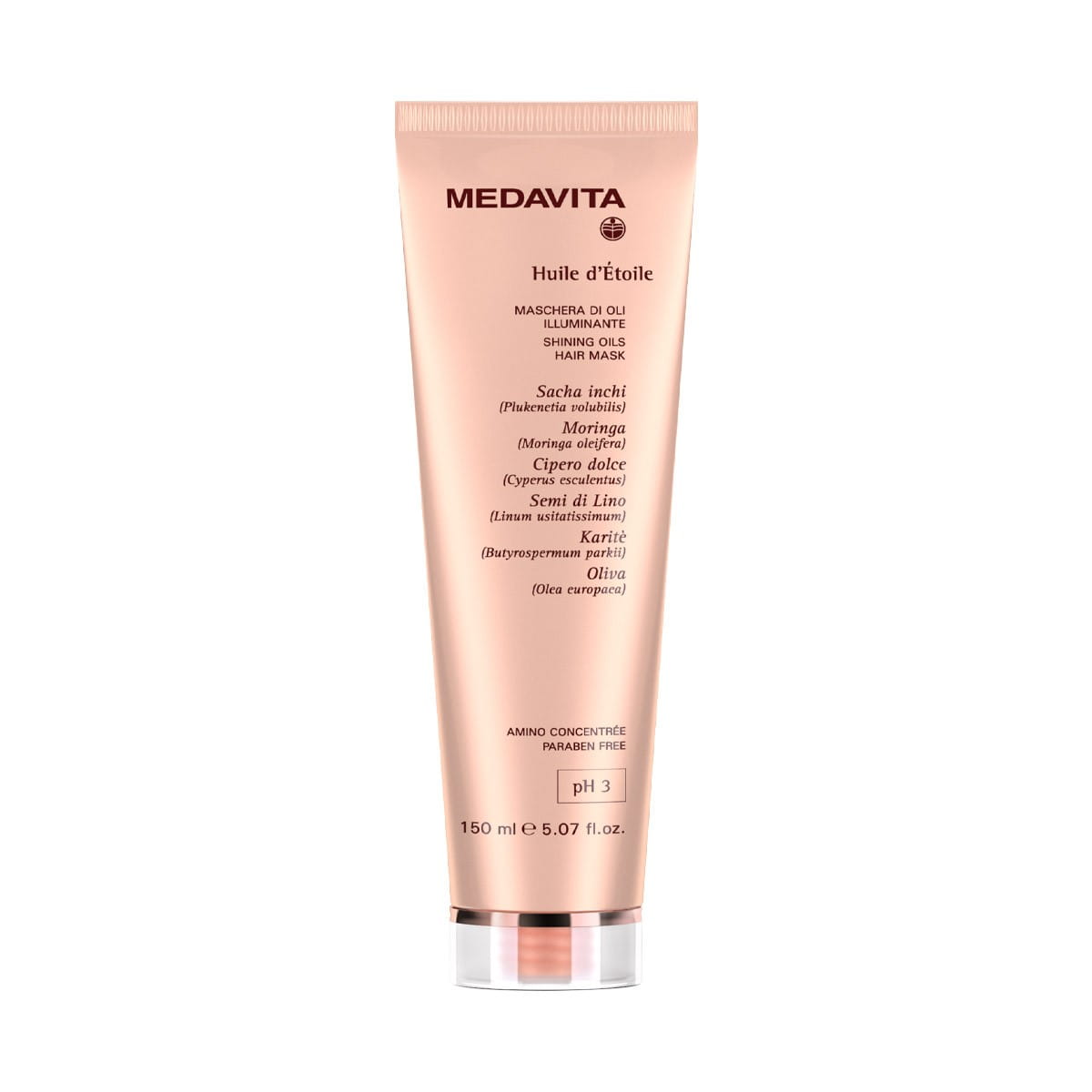Medavita Huile d'Etoile Maschera Di Oli Illuminante to luksusowa maska rozświetlająca o kwasowym pH 3.5, stworzona dla włosów potrzebujących natychmiastowego blasku i głębokiego odżywienia. Dzięki kompozycji drogocennych olejów (m.in. Sacha Inchi, Moringa, Cyperus oraz lniany), maska intensywnie rewitalizuje włókno włosa, domykając łuski i nadając pasmom niesamowitą lustrzaną gładkość. Unikalny kompleks Amino Concentré sprawia, że włosy stają się mocniejsze, bardziej elastyczne i jedwabiste w dotyku.
